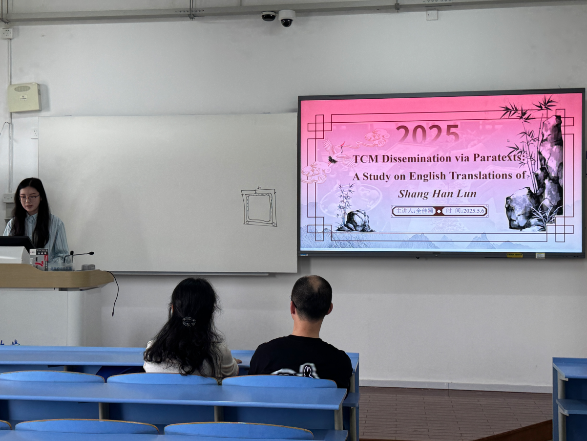 全佳颖同学作了主题为“TCM Dissemination via Paratexts:A Study on English Translations of Shang Han Lun”的读书报告。该读书报告以“副文本中的中医外译进程”为主题,详细介绍了Paratexts: Thresholds of Interpretation中的副文本理论,并结合《伤寒论》三个英译本中的序言进行分析,总结同一作品不同阶段译作的变化路径。