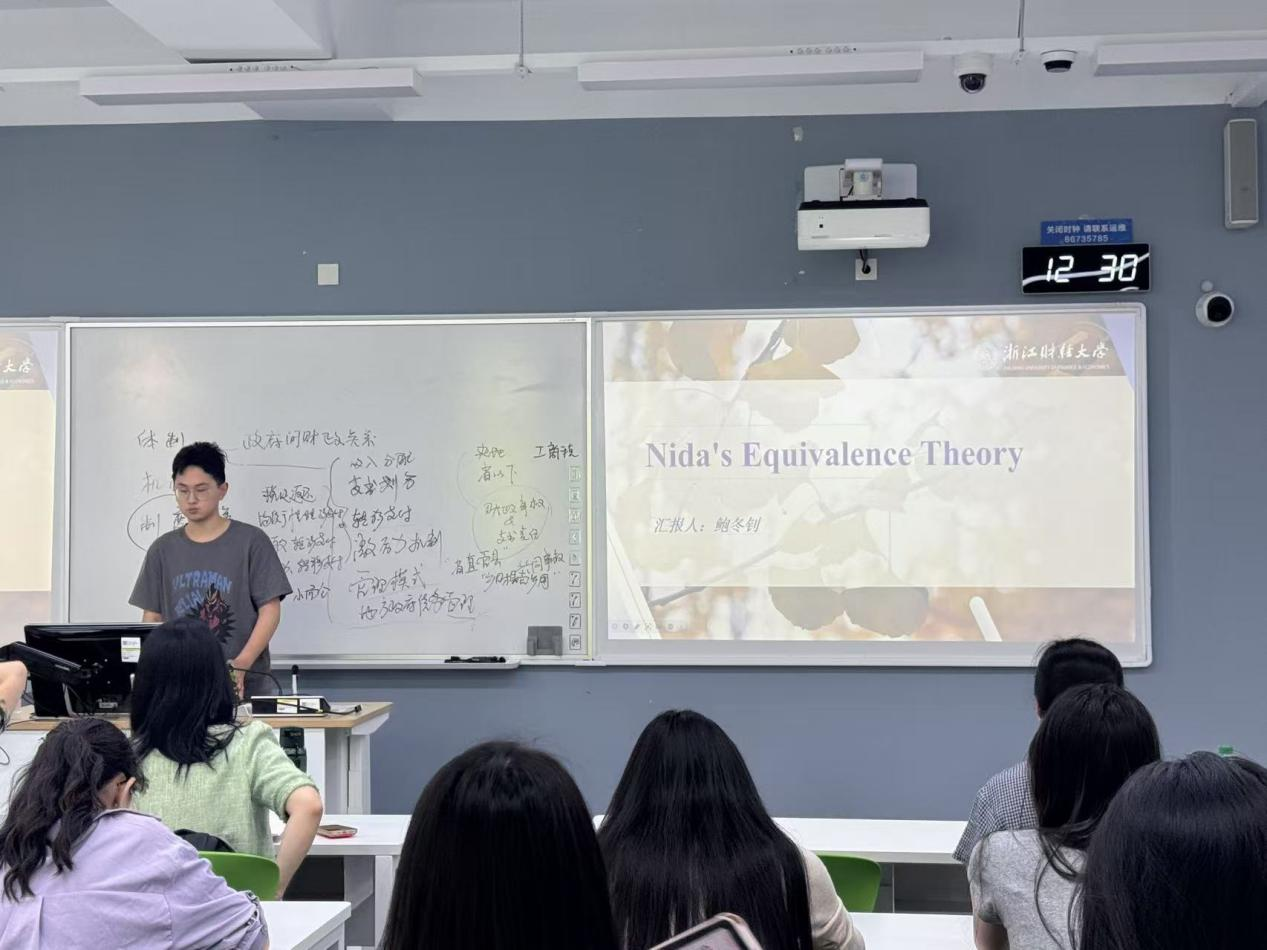 冯倩同学作了主题为“Gideon Toury THE NATURE AND ROLE OF NORMS IN TRANSLATION”的读书报告。该读书报告以“图里翻译规范”为主题,详细介绍了图里翻译研究规范的定义以及分类,其中包括预备规范和操作规范。同时简单介绍了学者如何运用Return Potential Model研究翻译规范,最后结合概念给出了翻译。