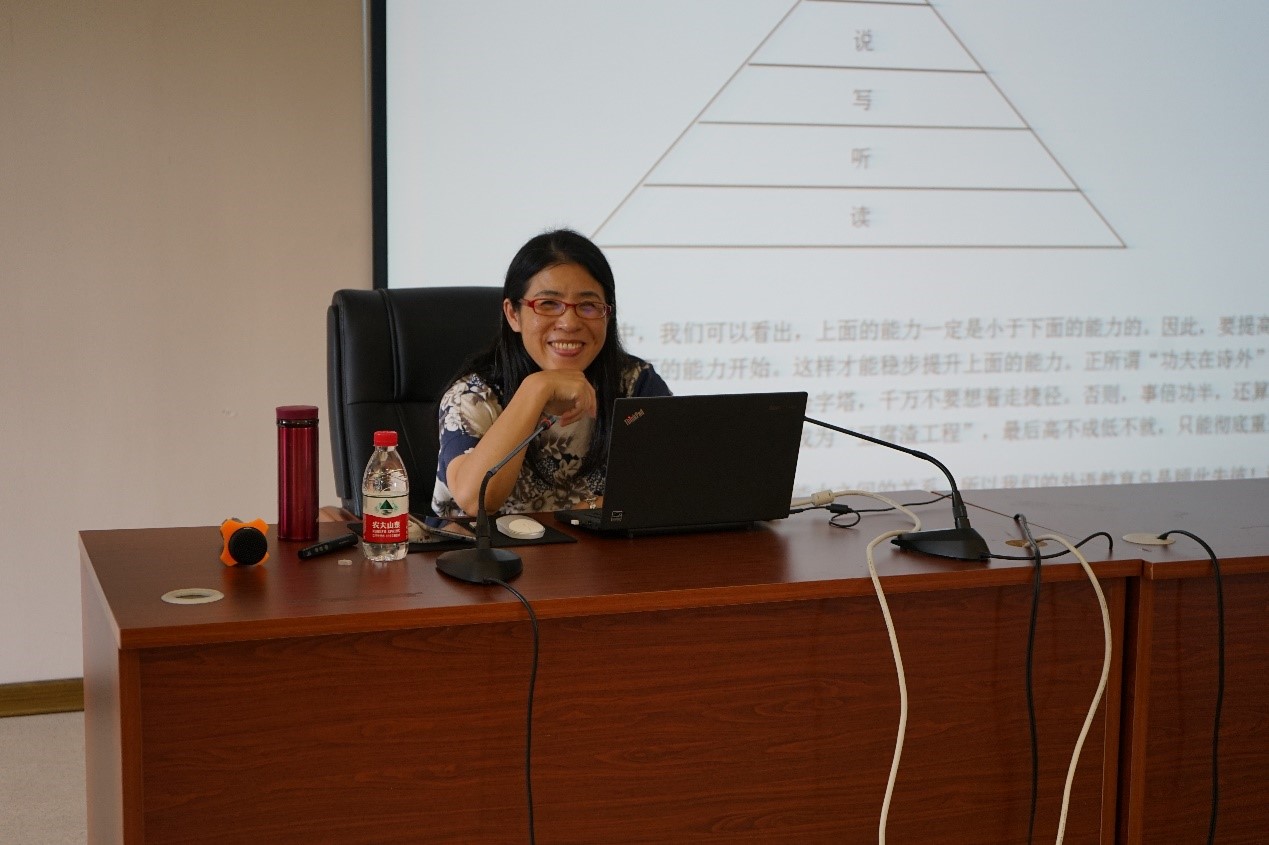 首先,吴老师详细介绍了她独创的基于“听、说、读、写、译”等五种基本技能的外语学习金字塔理论。吴老师认为,“读”与“听”是输入,处于金字塔的基础;“说”与“写”是输出;“译”是既有输入又有输出,处于学习金字塔的顶端。要提高翻译水平,我们必须加强“读”的训练和培养,加大原著的阅读量。