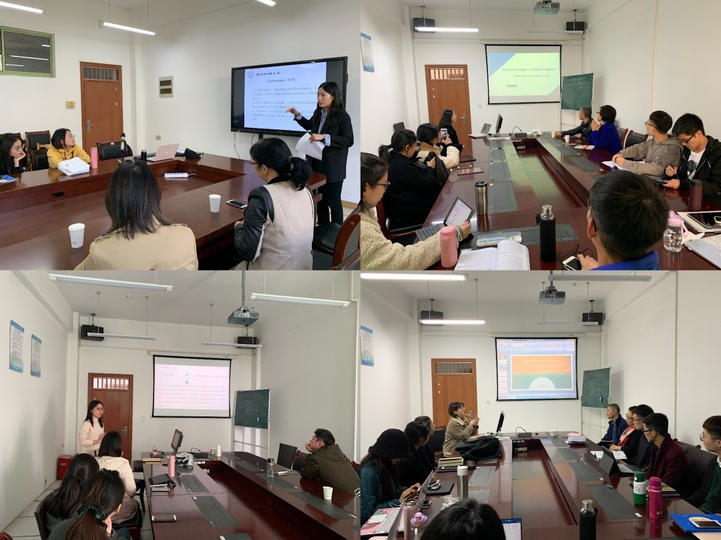 2019年12月3日,颜婷作了主题为“Discussion about Semantic Prosody”的读书报告,曹道根和张玲老师进行点评交流。该读书报告会主要针对semantic prosody这个概念进行了批判性评估,讨论了semantic prosody的定义、特点、研究方法等方面,并提出了此概念在学界中有争议之处。在交流讨论环节,曹老师和张老师与同学们展开了热烈讨论。