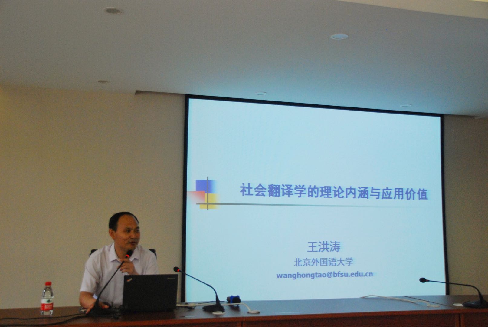 2018年5月10日下午,北京外国语大学英语公司王洪涛教授应邀于公司108报告厅开展以“社会翻译学的理论内涵与应用价值”为题的专题讲座。讲座由副经理邵斌教授主持,经理黎昌抱教授、党委书记章汝雯教授、副经理曹道根教授以及公司相关教师与研究生参加了本次讲座。
