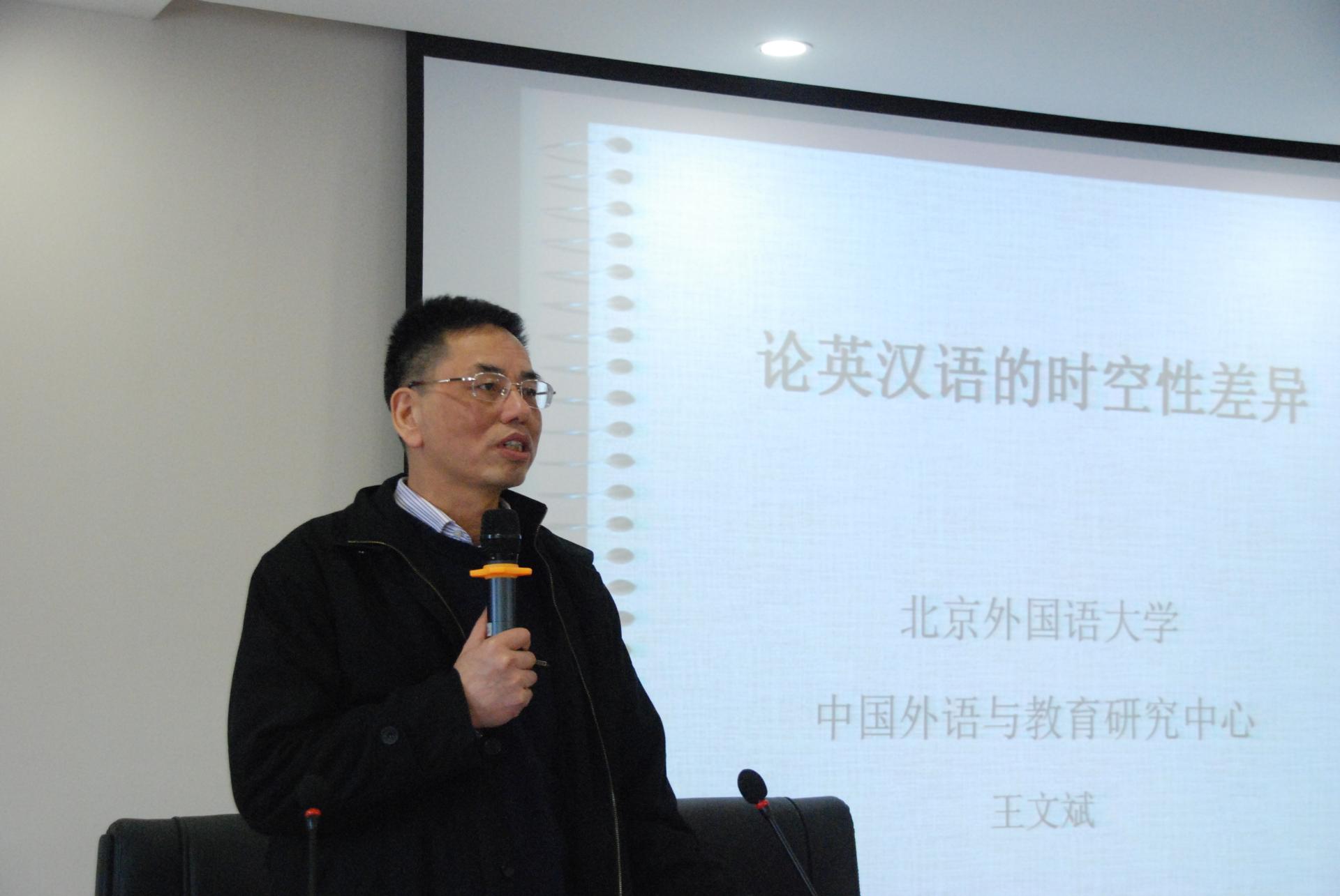 王文斌教授以英汉对比研究的意义为开端,旁征博引,对英汉语的时空差异做了细致而详实的阐述。王教授指出,汉语的语法研究至今仍存疑思:汉语究竟有无词类,有无单复句,主语和主题等问题,这都值得我们继续深入探索,而通过英汉语对比可以加深我们对两种语言的理解,而避免以印欧语的眼光来看待我们汉语的语法问题。他指出,汉语具有空间性,块状性,离散性和可逆性;英语具有时间性,勾连性,延续性和不可逆性。其本质的差异就是英语具有时间性,而汉语具有空间性。一个个生动的例子,一段段创新的分析,王教授渊博的学识、独到的见解以及幽默风趣的语言赢得了在场师生的阵阵掌声。