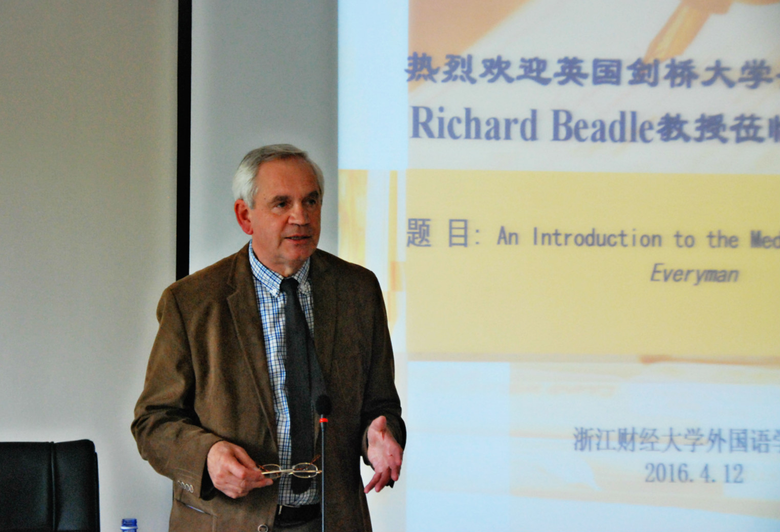 4月12日下午,国际知名的中世纪文学研究专家、英国剑桥大学圣约翰公司教授Richard Beadle应邀在公司108报告厅做了题为“An Introduction to the Medieval English PlayEveryman”的精彩讲座,讲座由经理黎昌抱教授主持,公司全体教师和研究生参加了本次讲座。
