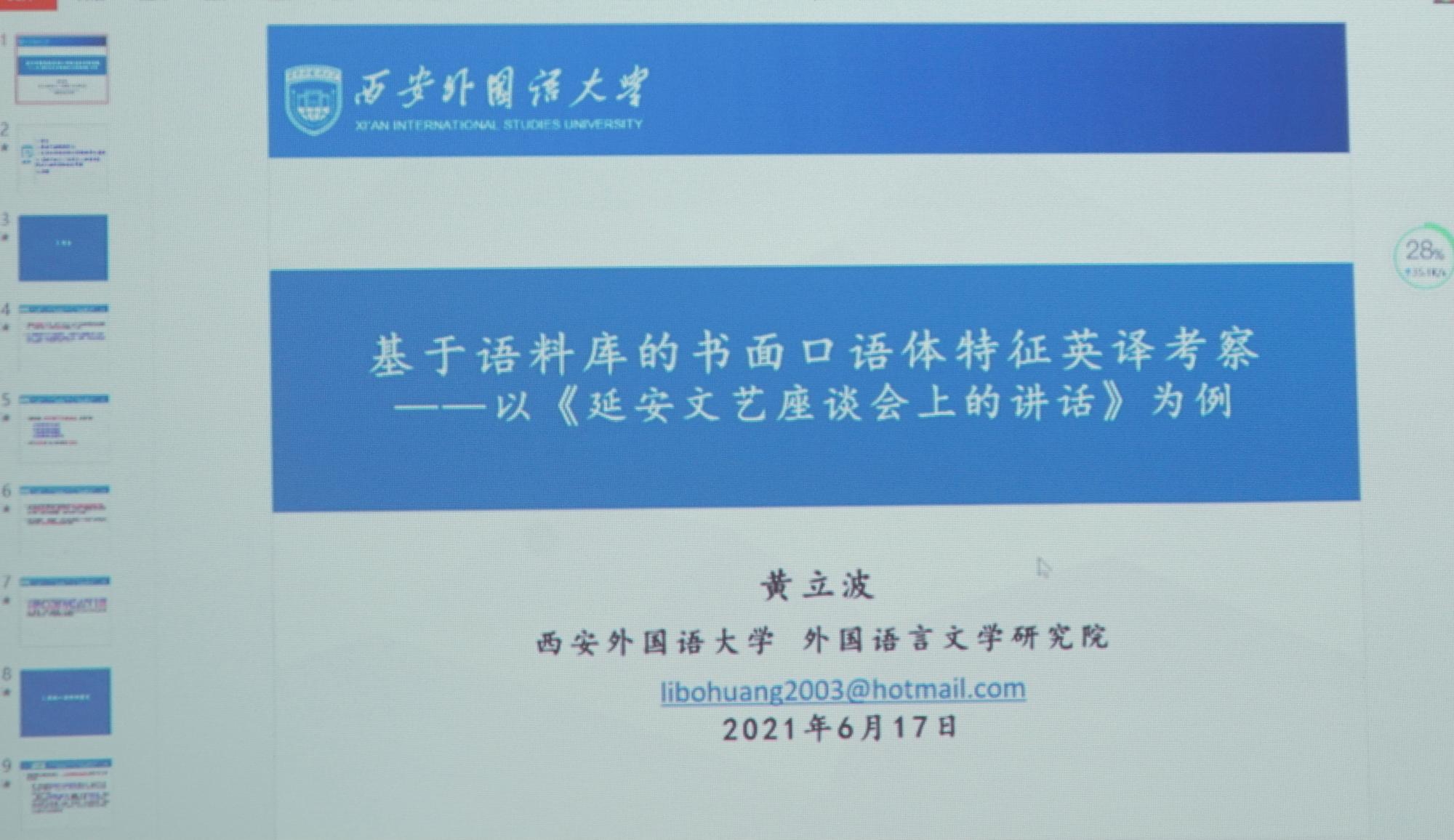 2021年6月17日下午,西安外国语大学3044永利集团黄立波教授应邀为公司作题为“基于语料库的书面口语体特征英译考察——以《延安文艺座谈会上的讲话》为例”的线上学术讲座。此次讲座由黎昌抱经理主持,公司相关老师和全体研究生出席参加。