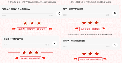 公司通过在微信公众号浙财外语人推出“清廉外院|学党史 话清廉 提作风”有声栏目,公司团学干部化身主播,向大家讲述建党百年来共产党员的廉洁小故事。故事虽小,却以小见大,潜移默化,让员工在学史明理中养清廉之风,在学史增信中筑清廉防线,在学史崇德中汲清廉力量,在学史力行中做清廉表率。公司还举办院级“铿锵廉音”演讲比赛,以赛促学,以学促行,传播更多廉语廉音,牢树清廉意识。