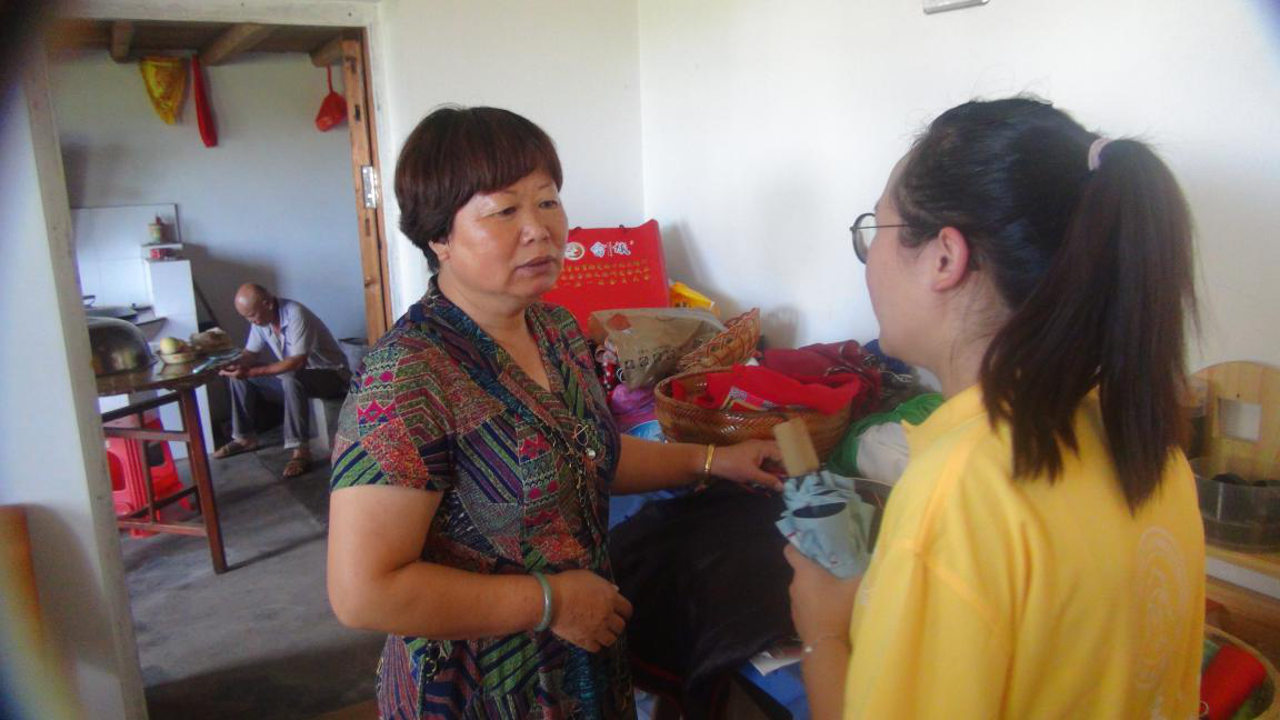 当天下午,队员们去到了温州市重点建设村——岱岭畲族乡富源村,并有幸拜访了省级非物质文化遗产继承人蓝瑞桃老师。蓝老师用针线绣出富有特色的畲族服装,勾勒出精美的图案。蓝老师告诉队员们,她从十几岁就开始学习手工刺绣了,她的两个姐姐是市级非物质文化继承人,她们姐妹几个都坚持手工刺绣。除此之外她们还是畲族传统歌曲的继承人,蓝老师的表演曾在浙江省的省赛中获一等奖。平日里,蓝老师在村子里面教大人小孩们唱畲族歌曲,传播着畲族文化。说起这些,蓝老师脸上洋溢着幸福而满足的笑容。