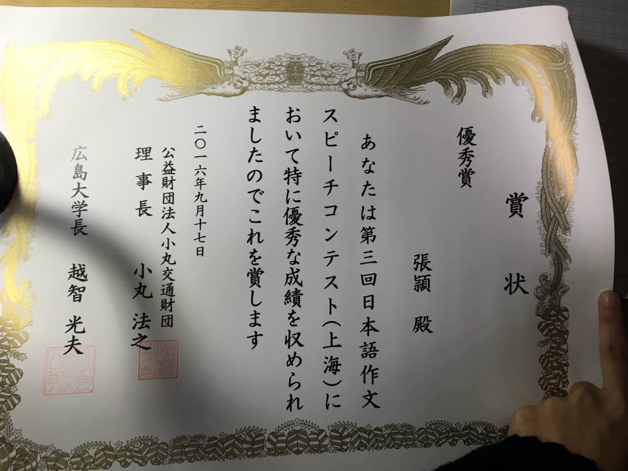 9月17日下午,第三届日语作文•演讲比赛(上海)决赛在上海师范大学举行,来自华东地区的上海外国语大学、上海师范大学、江苏大学、江苏师范大学等高校的40余名选手参赛。公司张颖同学表现优异,演讲获上海总领事馆特别奖(唯一)和演讲优胜奖,写作获广岛大学颁发的“佳作奖”。