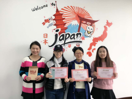 颁布奖项之后,同学们手持奖品和奖状在日语系办公室的绘墙下留影。至此,日语假名大赛宣告圆满结束。