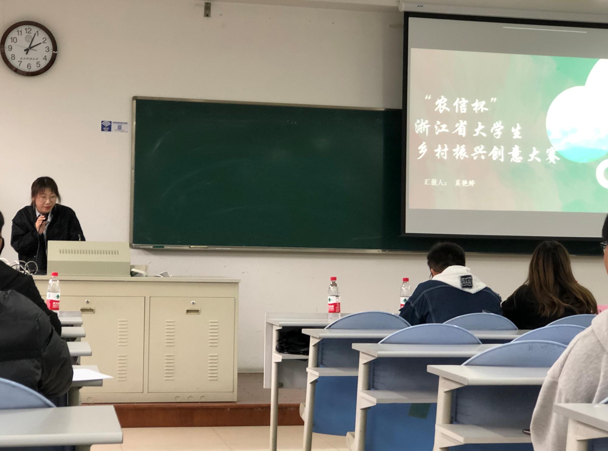除此之外,本次活动还特别邀请艺术公司18级的林颖奕,她曾获“农信杯”浙江省乡村振兴创意大赛金奖,在此次分享会她简短地分享乡村振兴大赛期间准备的相关经验,希望大家能够结合自己的兴趣参加比赛,不能顾此失彼,应合理安排时间,统筹兼顾。