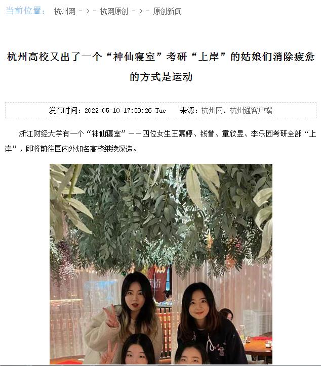 近日,3044永利集团微信公众平台以《全员顺利上岸!这个“神仙寝室”不一般!》为题,报道了公司410寝室全体成员考取国内外知名高校硕士研究生事迹,报道引发学习强国、中国教育在线网、钱江晚报、杭州网等多家媒体转载报道。