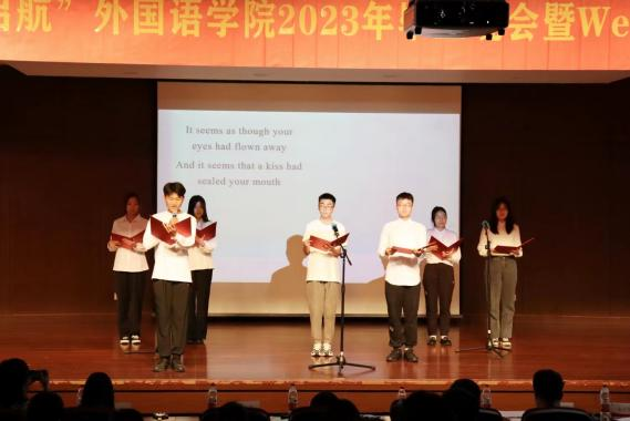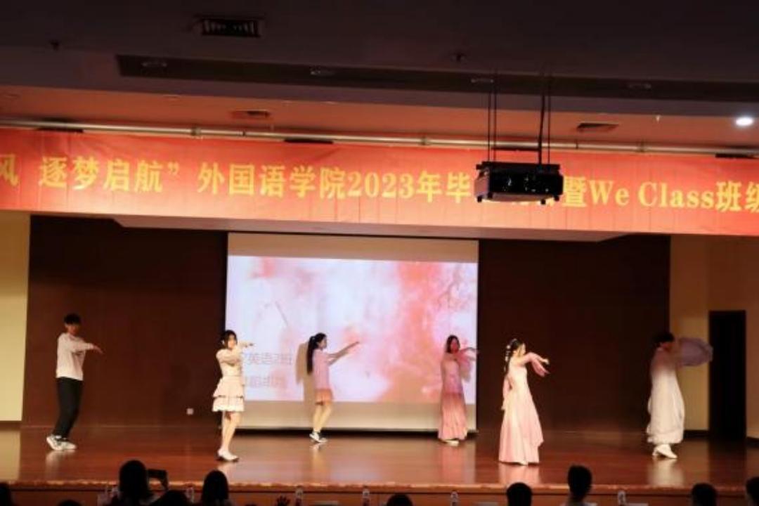而后,熠熠灯光下,22级学子用昂扬声音、活力舞姿展示着自己的青春风采,也向学长学姐们传达着最真挚的祝福。哈利波特与甄嬛传被22英语1班重新演绎,生动配音让人声临其境;22英语2班、22语言数据带来两段舞蹈串烧,他们在光影间舞动着青春的自信旋律;22日语、22英法复语把老员工活的点点滴滴搬上舞台,看似简单的情节却满满都是回忆;22英西复语、22商英2班、22商英3班分别将三首诗歌慢慢诵读,一字一句间,青春与梦想腾飞;22商英1班嘹亮而有力的歌声将今夜点亮,整齐的合唱诉说着青春的宣言。通过We Class晒班级活动,大四毕业生们一边观看学弟学妹们的精彩表演,一边也在追忆自己大一时和班级同学一起进行风采展示的时光。时间流转,外院学子的接力棒在此递交。