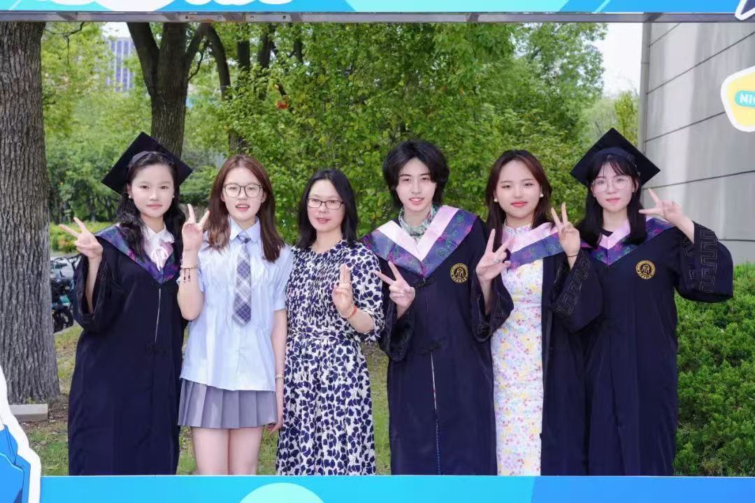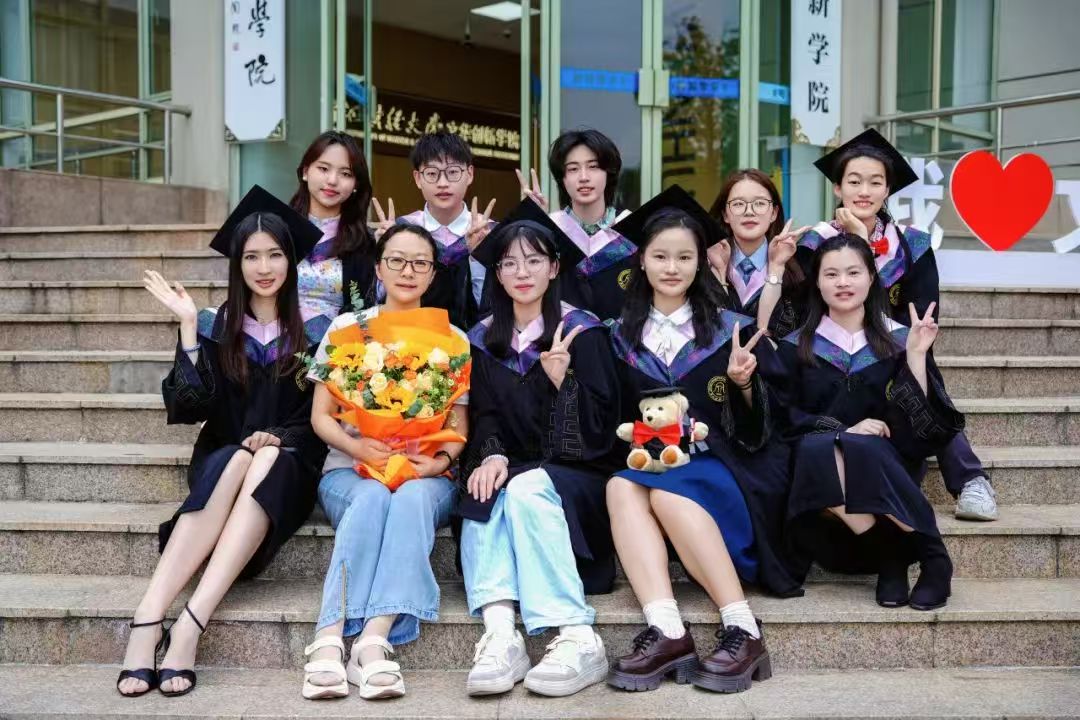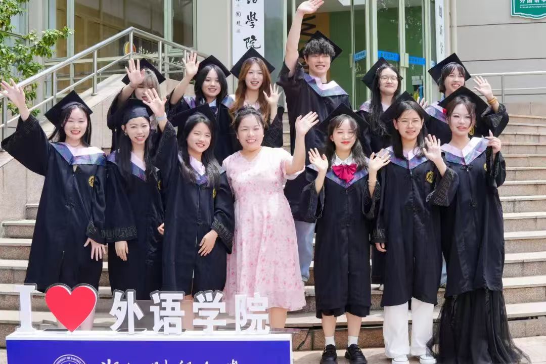 在师友、家人的共同见证下,在全场热烈的掌声中,英语、日语、商务英语专业本科生及研究生们依次上台,拔穗正冠,与师长合影留念。