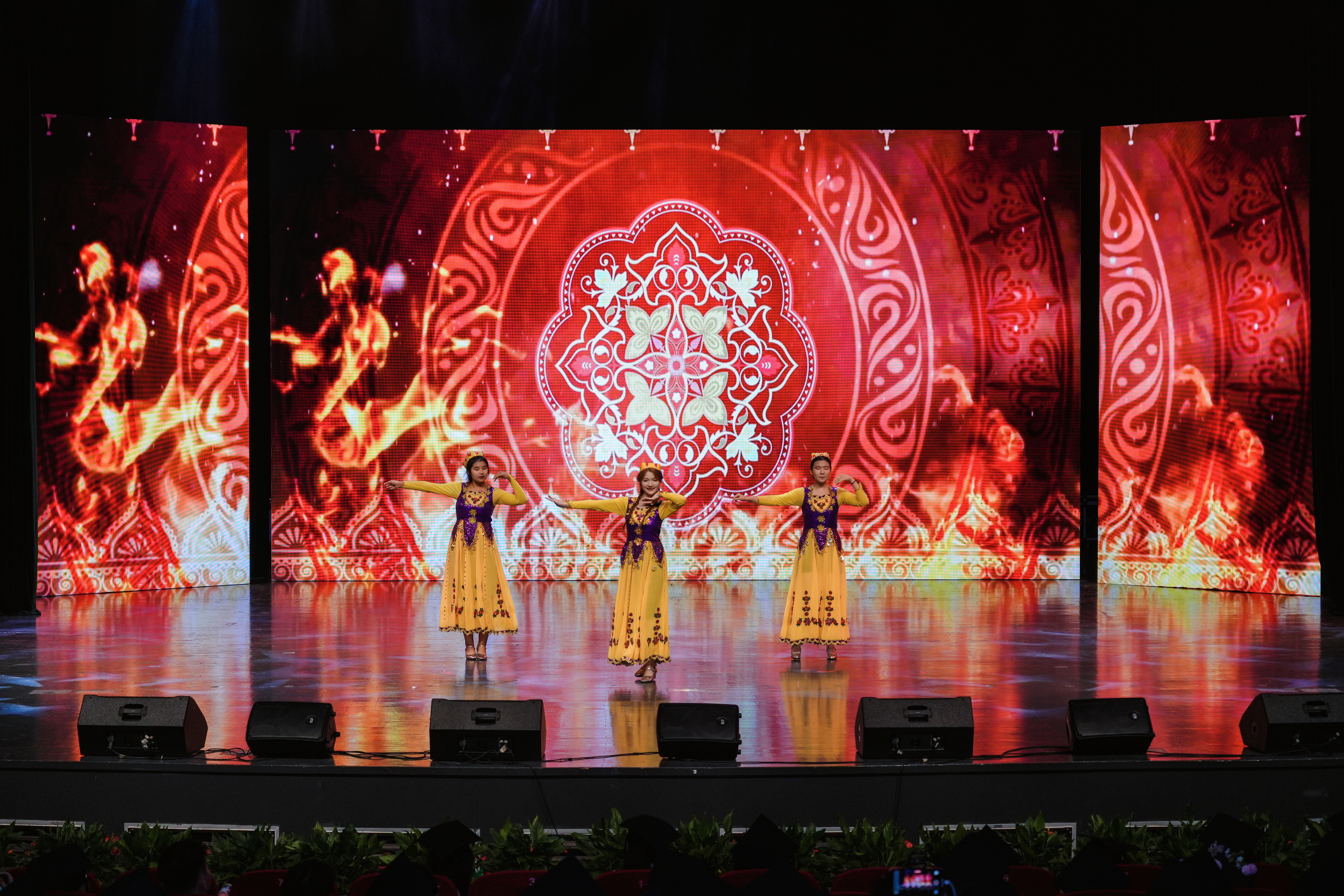本次毕业典礼暨毕业晚会分为“韶光初绽—锦瑟流年—逐梦远航”三大篇章,结合仪式环节与多元化演出,融合中外文化元素、少数民族风情特色,为毕业生打造一场兼具仪式感与温情的青春盛典,留下珍贵校园记忆。