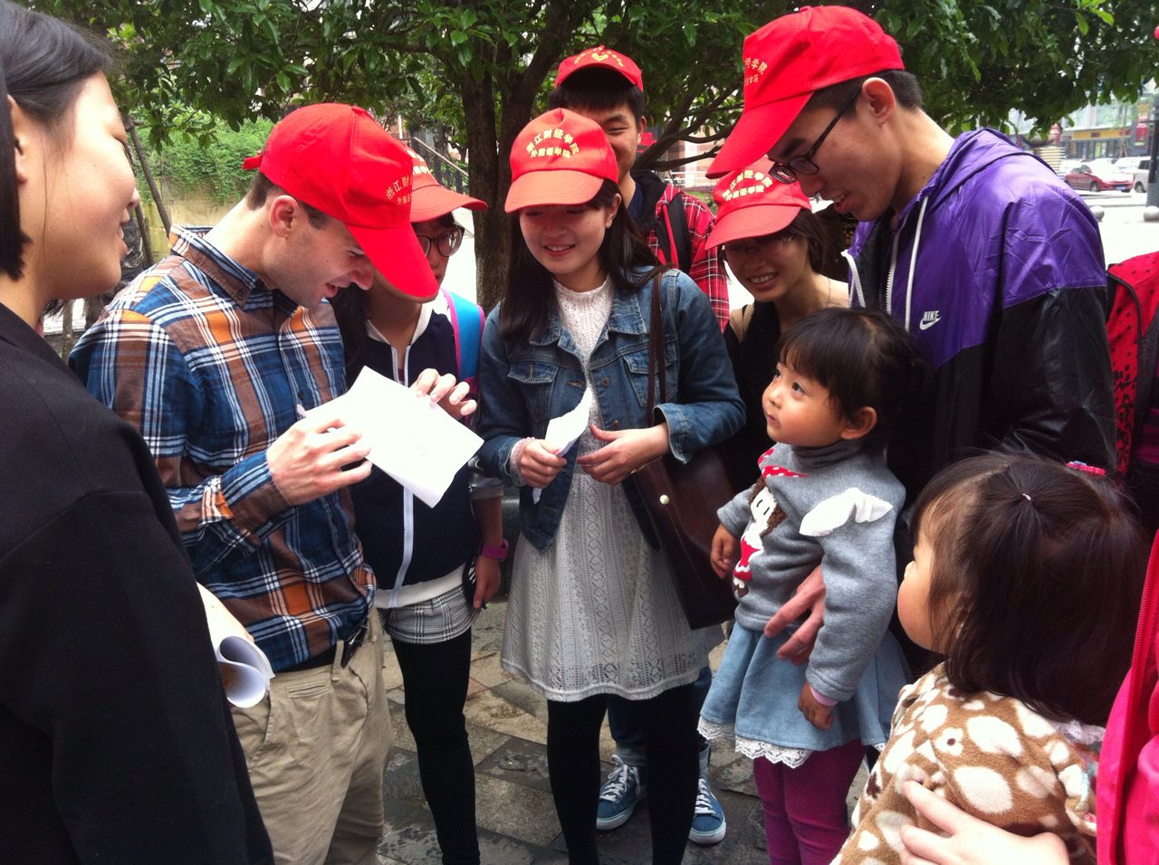 4月26日,春雨初霁,朗琴社区公园里,姹紫嫣红,青枝绿叶,春色怡人醉。迎着大好春光,来自3044永利集团的青年志愿者们在朗琴社区广场上开始了他们的“英语角进社区”志愿者服务活动。