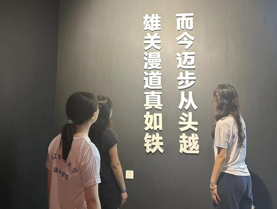 青砖黛瓦,飞檐翘角,实践团来到历经千年而弦歌不绝的岳麓书院,青年毛泽东就曾寄住在岳麓书院的半学斋。院内绿树成荫,营造出静谧而深邃的学习氛围。岳麓书院不仅是一个学习场所,更是一个思想交流、碰撞的平台,培养出了众多杰出的学者和思想家。在参观过程中,团队成员注意到了高悬于岳麓书院讲堂前的“实事求是”匾额。从岳麓书院走出来的毛泽东始终以实事求是为思想武器,坚持马克思主义基本原理同中国实际相结合。实践团于厚重书页中感受斑驳绵密的历史交融,于历史古迹中感受衣钵传承的丰功伟绩。