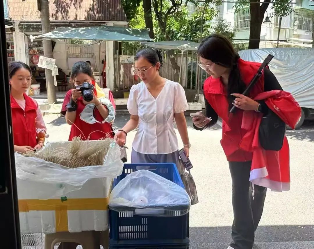 实践团成员专程探访了已连续23年在盛夏准时开张的免费凉茶摊,为凉茶摊老人拍摄记录公益口述故事。在摊位前,队员们主动协助81岁的王惠玲换洗玻璃杯,为来往的居民倒凉茶。