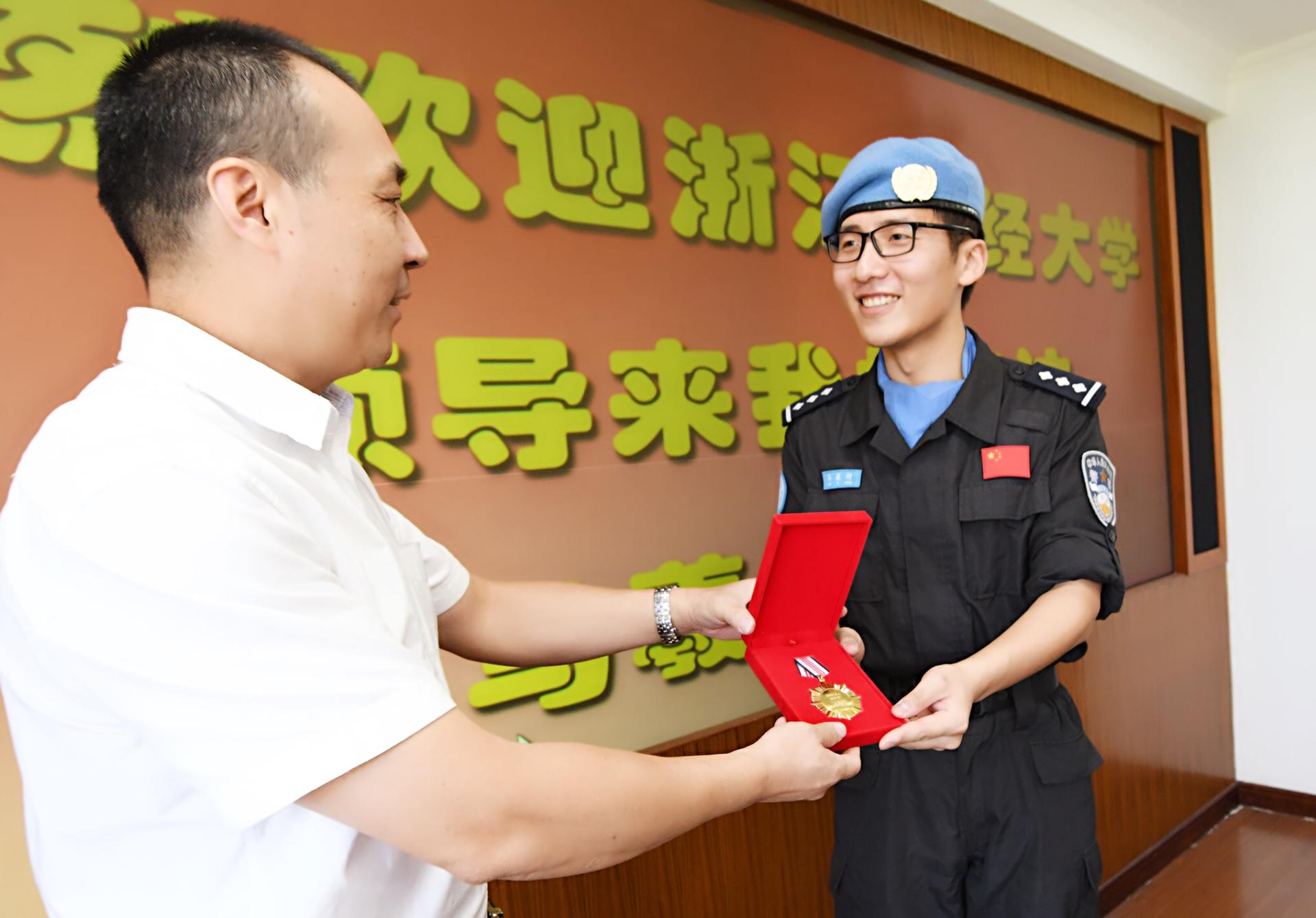 李金昌书记亲切问候马義超,赞许他是财大优秀毕业生,是母校的骄傲。李书记向杭州边防检查站表示感谢,也介绍了公司的办学特色和优势,以及员工工作的开展情况。随后,他为马義超颁发校第三届“最美浙财人”桃李奖章和党校教师聘书。