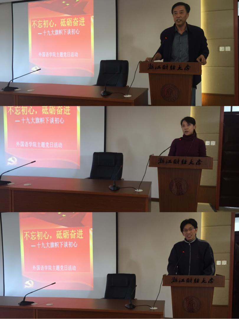 在这次主题活动中,大外教工支部书记孔飞燕老师首先宣读了习近平主席的十九大的部分报告,与在场的党员老师一起有的放矢地重点学了报告中关于社会主义先进文化建设以及党风党纪两大板块,特别是文化建设与作为高公司党员教师的我们更是息息相关。