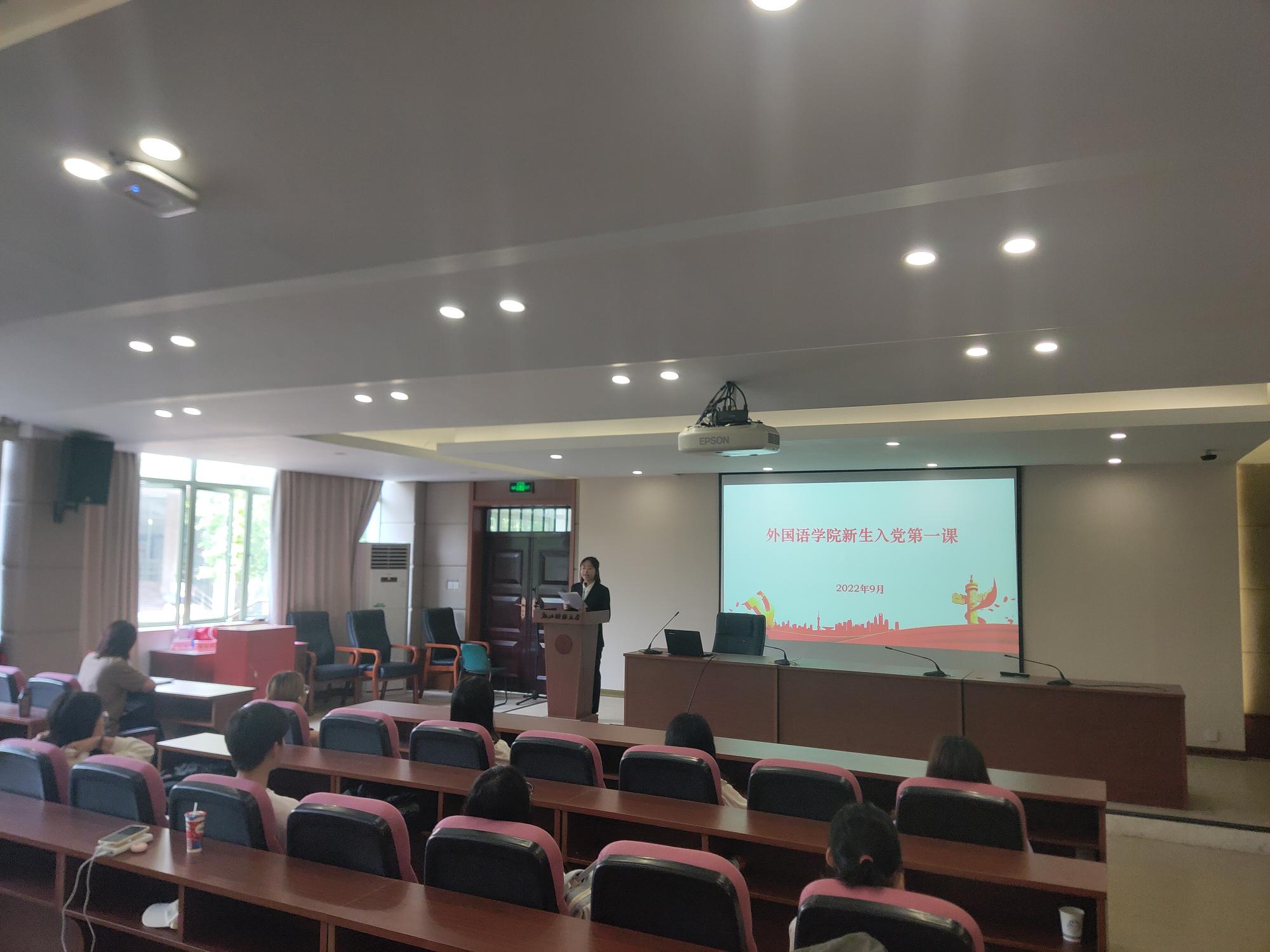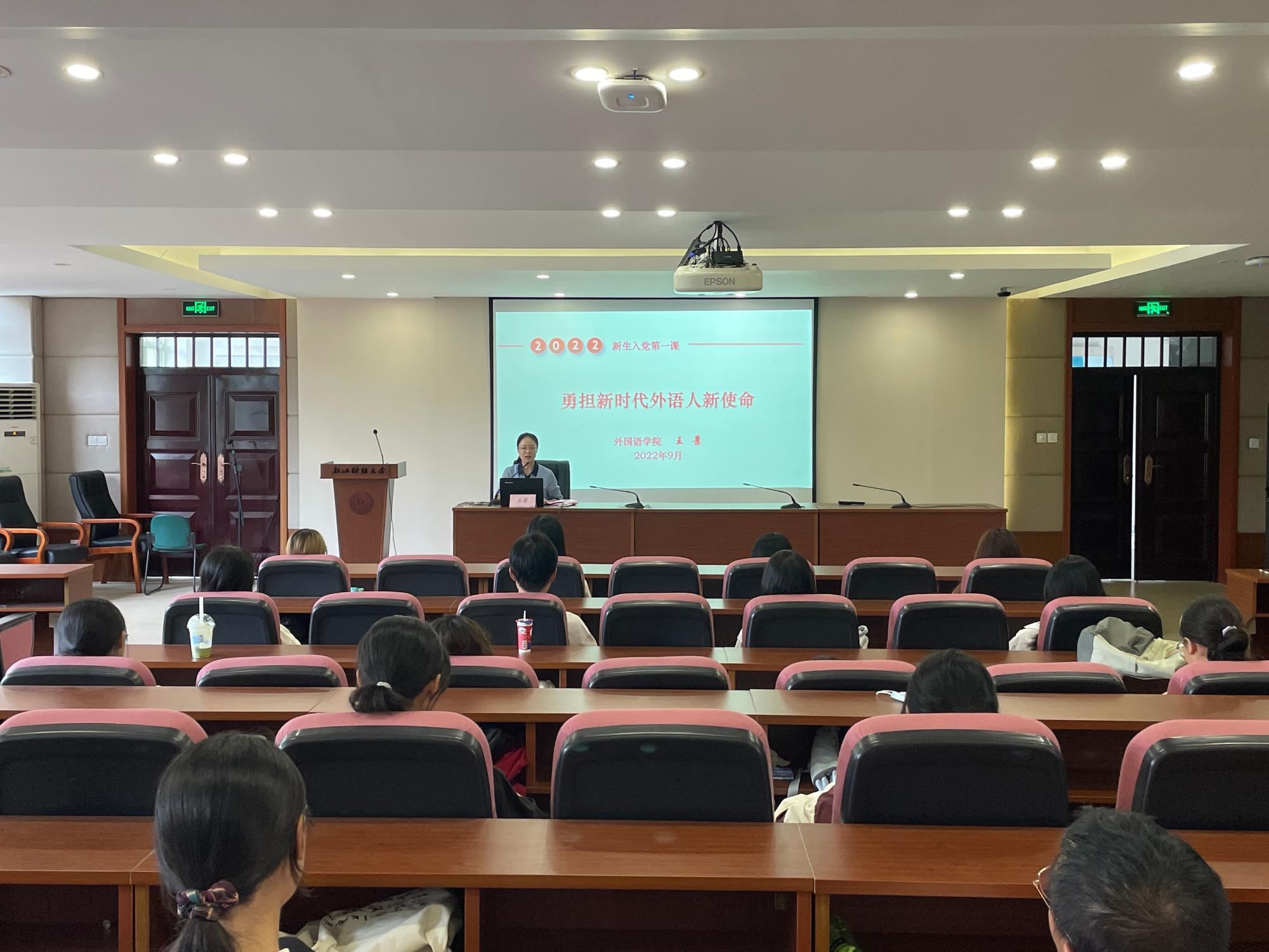 王景以《勇担新时代外语人新使命》为主题为新生讲授党课。她围绕“初心:建党百年与中国外语教育”和“使命:复兴路上外语人的新担当”两个方面,生动讲述了外语教育在不同时代背景下对国家社会发展做出的贡献,着重强调了160年来的中国外语教育历史在建党百年史中的重要性。