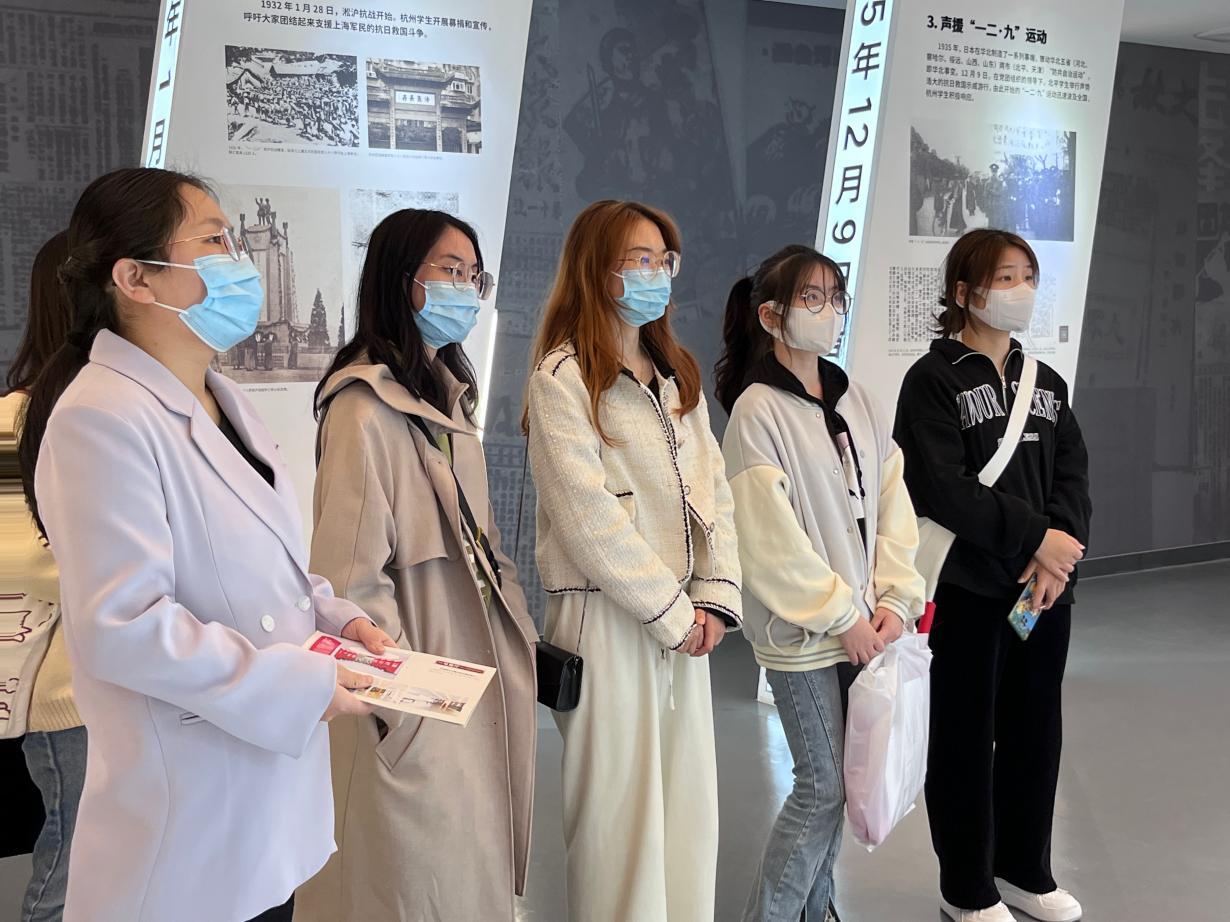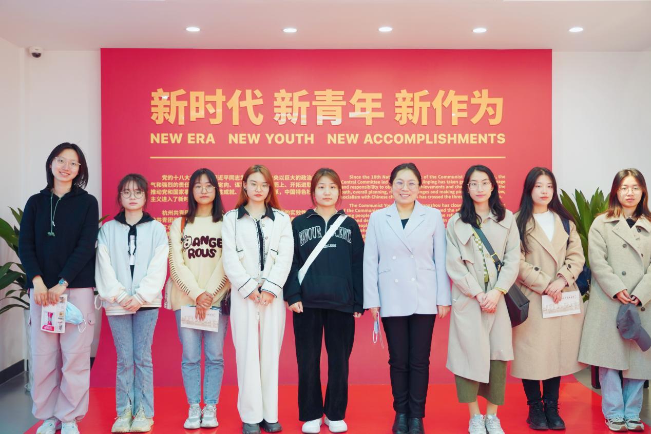 上好以革命文化为核心的理想信念教育课。支部党员与“红星导航”辅导员工作室“红星传忆”实践团成员前往杭州青年运动史馆开展红色研学,深入了解了百年杭州青年运动的历史,从“建立新中国”到“参与社会主义建设”、再到“在建设中国特色社会主义中建功立业”,烈士英雄的感人事迹和展厅中的一幅幅照片、一幕幕场景、一件件实物,给在场的每个人都带来了强烈的心灵震撼和精神洗礼。在场师生依次站在对应位置的青年烈士雕塑前,穿越时空感受着杭州革命青年英勇就义的悲壮场景。“裘古怀遗言中留下的那句:‘胜利的时候,请你们不要忘记我们。’同学们读到这段的时候,心里非常沉重,,更加坚定了传承五四青春火炬的决心。