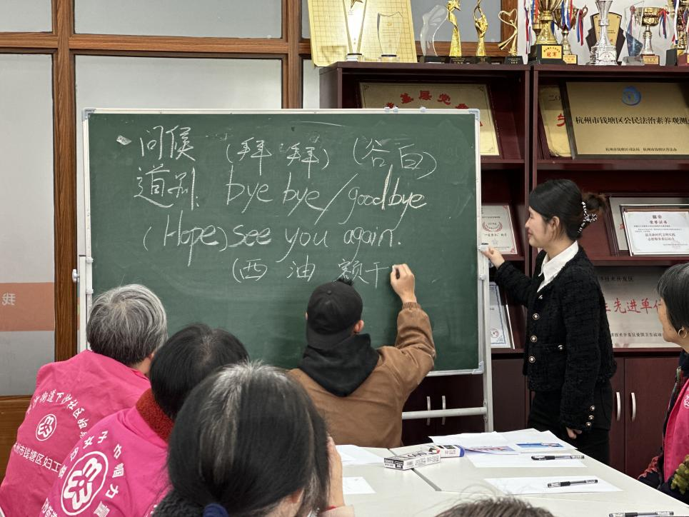 上好以亚运服务为主题的劳动教育课。同学们积极参与到“全民学英语 一起迎亚运”为主题的活动中,前往下沙街道,结合商务英语专业特色,通过趣味互动的形式,教社区居民学英语、用英语、说英语。同学们用提前准备好的卡片展示了亚运会的运动项目,采用单词连线和提问的方式与居民们积极互动,在场的居民张奶奶特别好学好问,不仅很快记住了单词,还额外学习了其他句子,“员工教我们怎么给外国友人打招呼,还有指路的常用词,非常实用,原来我也可以做个国际化的‘奶奶’!”同学用提升杭州城市国际化水平的实际行动,践行着“奉献、友爱、互助、进步”的志愿服务精神。