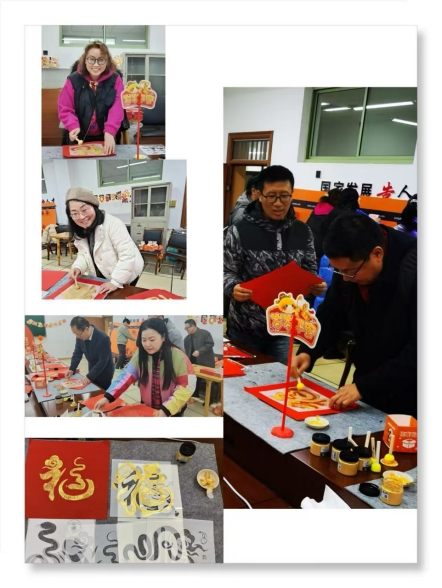 在送福到家活动区域,老师们挥毫泼墨写福字、送祝福,现场还有拓印福字活动,老师们在红纸上拓印名类福字图案,妙趣横生。
