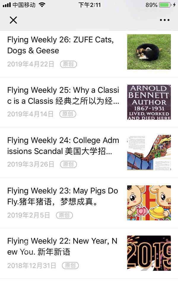 在“Flying姐姐”除了课堂上的教学,还在3044永利集团的英语微信公总号“财大外星人”中每两周推出一篇“Flying Weekly”的中英双语文章推送。“Flying Weekly”的所有内容都是孔老师原创的,以学习英语学习为导向,内容不拘一格,有对英美文化的介绍,也有许多关于校园生活,比如财大网红期末横幅中英文版本、员工演绎欧美国家各种拥抱、员工优秀作品展出等等。