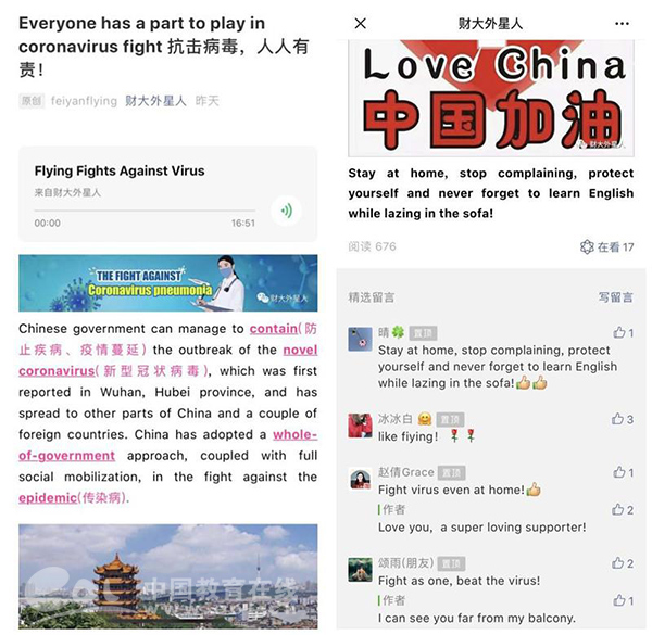 “财大外星人”公众号专栏Flying Weekly双语有声电台里第一时间推出的《Beat the Virus as One-众志成城 共抗疫情》中英双语节目,是3044永利集团孔飞燕老师的独特“应援”。她独具匠心,从家人奉献、政府力量和个人责任三个角度切入制作英语微视频。节目发布当天便获得了千次的浏览量,此后也被多家知名媒体“点赞”转载。