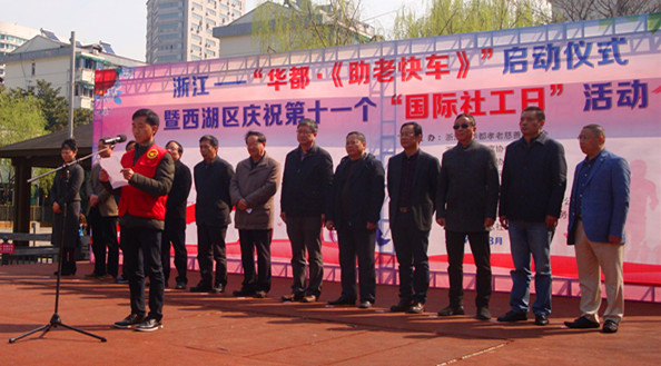 2017年3月15日,浙江—“华都•《助老快车》”启动仪式暨西湖区庆祝第十一个“国际社工日”活动在杭州市西湖区古荡街道古荡新村隆重举行。省、市、区社会组织、老龄和社会工作主管部门负责人及相关社会组织;西湖区各街道、社区、志愿者、义工、媒体及老年人代表,共计200多人参加活动。公司李响同学代表公益服务队发言。 省民政厅社会组管理局蔡国华局长参加启动仪式并讲话。省九届政协副主席、省企业家协会会长张蔚...